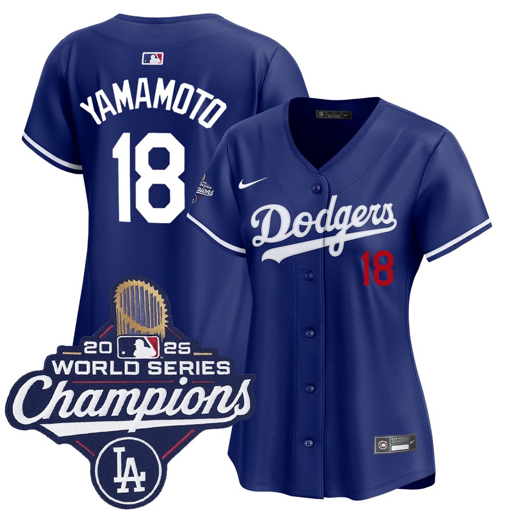 Women's Los Angeles Dodgers #18 Yoshinobu Yamamoto Nike Royal 2025 World Series Champions Home Limited Jersey
